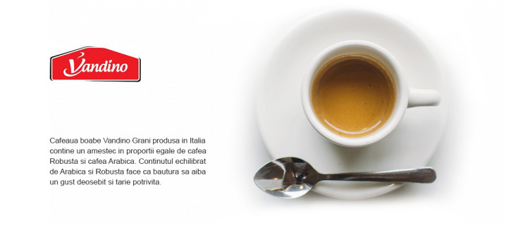 Cafeaua boabe Vandino Grani, produsa in Italia, contine un amestec in proportii egale de cafea Robusta si cafea Arabica.