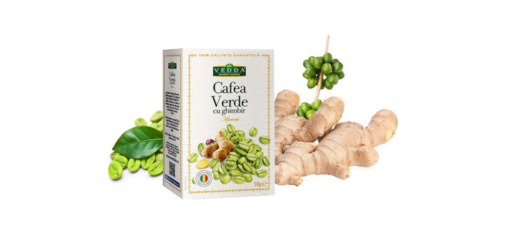 Cafeaua Verde cu Ghimbir, produsa de Vedda, este disponibila la cutie de 50 gr.