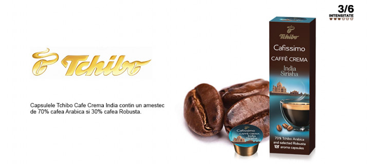 Capsulele Tchibo Cafe Crema India contin un amestec de 70% cafea Arabica si 30% cafea Robusta.