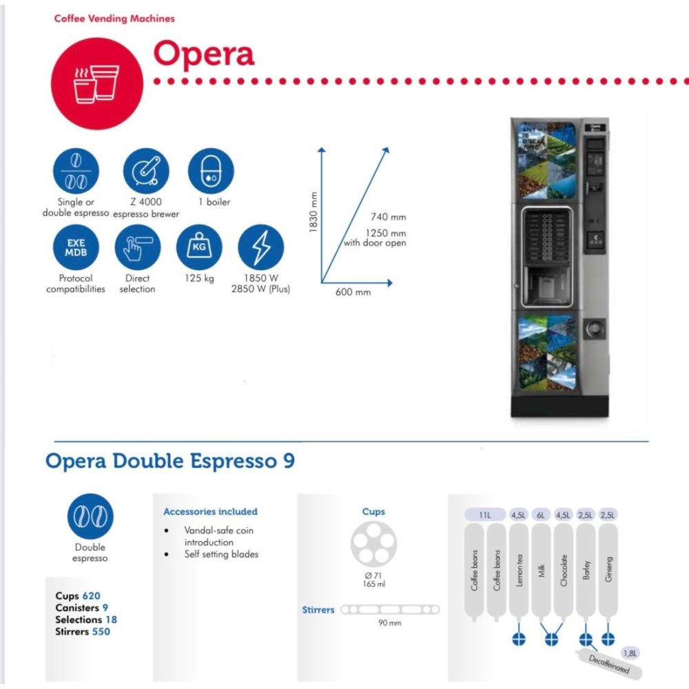 OPERA DOUBLE ESPRESSO 9 este un automat produs de Necta. Acesta ofera o gama larga de bauturi de calitate si face fata cu usurinta fluxului mare de clienti.
