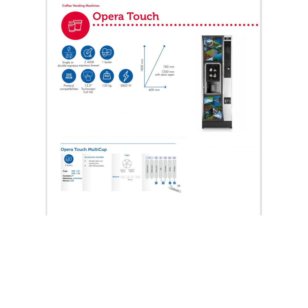 OPERA TOUCH ESPRESSO Multicup este un aparat complet automat, produs de Necta. Acesta ofera o gama larga de bauturi de calitate si face fata cu usurinta fluxului intens de clienti.